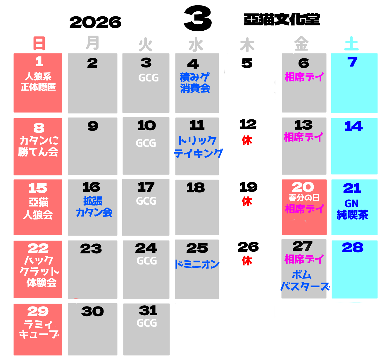 毎週の様々なボードゲームイベントのほか、