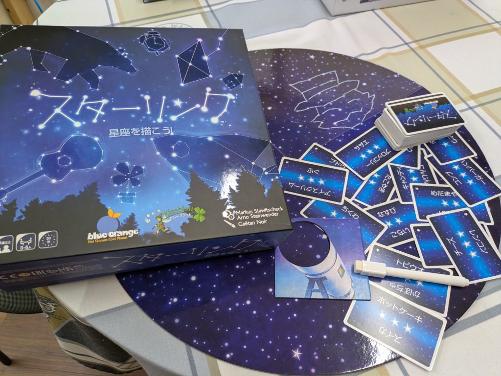 ボドゲくじで1000円で当ててしまったラッキーゲーム。カードに書かれたお題を夜空のボードの星でつないで表現し当ててもらうイメージ系ゲーム。決められた大きさに描くとさらにボーナスがもらえるらしいが難しい。