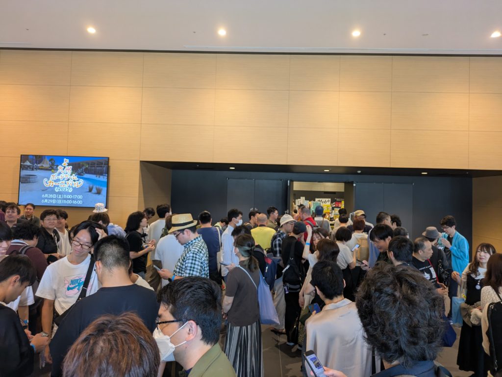 開場前からこの人の列!外は暑いので室内の会場入り口のドアからうねる様に大勢の人が並んでいた!ちょっと感動した。ちょこちょこ知り合いがいたのだが亞猫は鳴りやまぬ興奮で全然気づいておらず後で上の画像をみて「俺写ってましたよ」と言われ挨拶できず申し訳ない気分になった