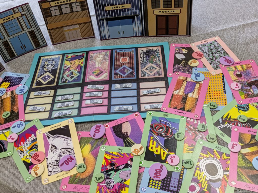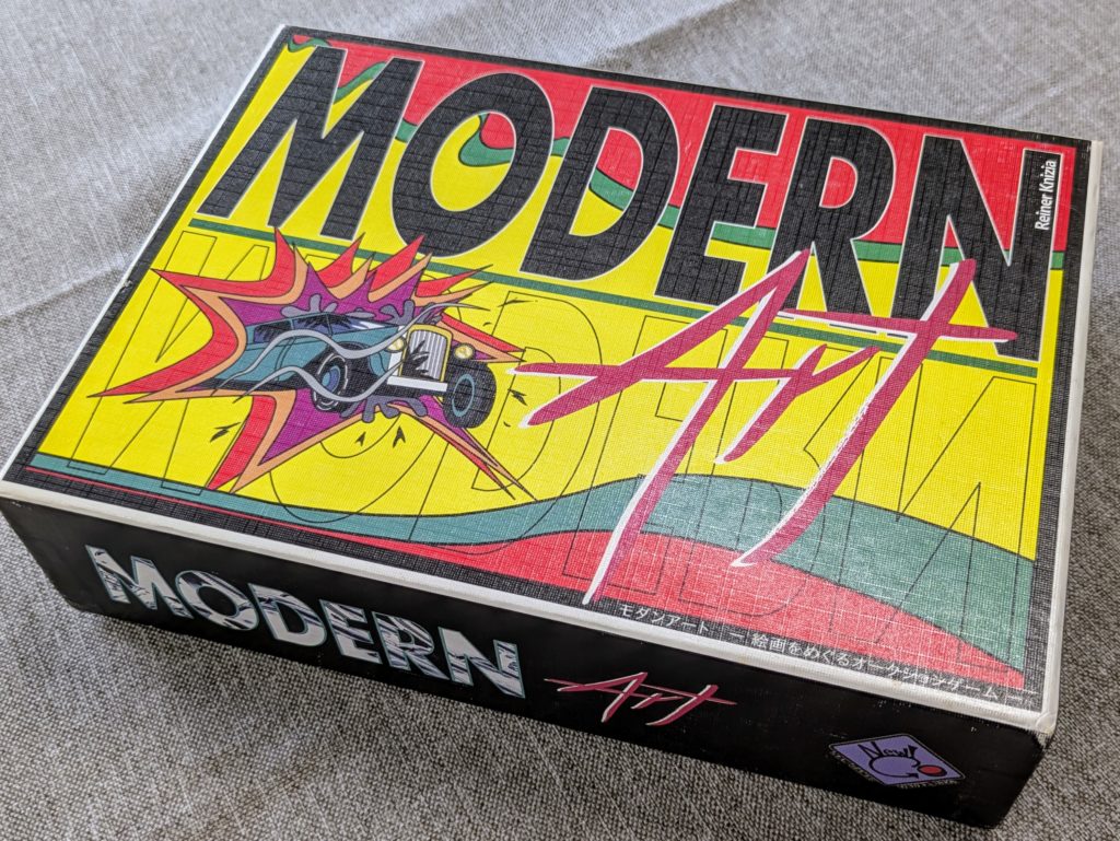 | ゲーム内容 | 世界の画商になって前衛アートを売り買いしお金を稼ぐゲームです。5人のアーティストは作品数が同じでなく偏っています。所持金100と作品をランダムで規定数配られスタート。手番ではカードを1枚もしくは2枚出し競りが始まります。競りの方法はカードの上にアイコンで描かれており毎回変わります。アイコンは5つ<自由入札>手番が提示した値段を自由に吊り上げ最高値を出したプレイヤーが獲得する<一斉入札>お金を手ににぎり全員が手を出したらオープンし最高値が獲得<一巡>手番の左のプレイヤーから値をつけ最後のプレイヤーがつけた値で手番プレイヤーが買うかを選べる<指値>手番プレイヤーが出した値で買うかを1巡で決める先のプレイヤーが買うと終わり誰も買わないと手番プレイヤーが買うことになる<ダブルオークション>2枚のオークションが行われ方法はもう1枚のカードのアイコンの方法で行われる。同じ色の作品の4枚目が出されたらオークションは行われずラウンドが終了。多く出された作品に3000、2番目に2000、3番目は1000と値がつきこれまで手に入れた作品が売却される。そして新たに規定数のカードが配られ次のラウンドがスタート。1ラウンドに1000ついた作品が次のラウンドで3000の価値が付くと売却額は4000と値が上がる。最終の4ラウンドまで来た頃には物凄い値が付きオークションの取引額もインフレを起こしていく様子が体感できるのでゲームに熱も入って来る素晴らしいゲームです |