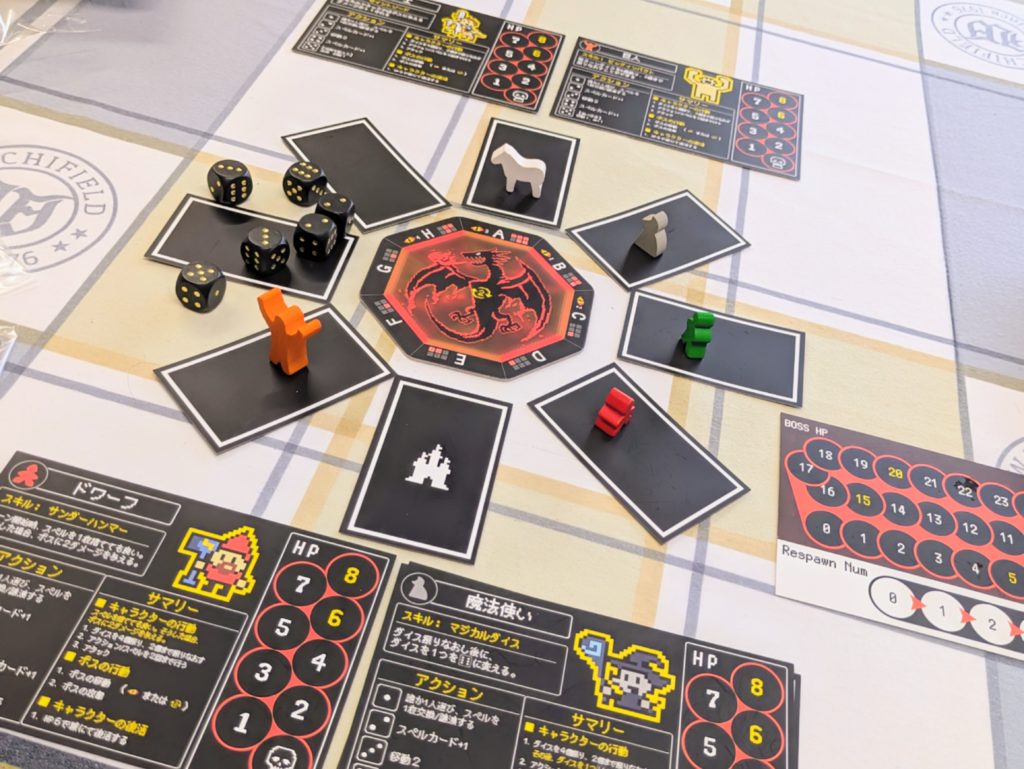 | ゲーム内容 | このゲームの目的は、全員で協力して強大なモンスターのヒットポイント(HP)を削りきること。まさにRPGのクライマックスのような手に汗握る展開が待っています。 ■ 基本ルール:ダイスの目とスペルで道を切り拓け! 中央に鎮座するボスの周りを、プレイヤーである勇者たちが移動しながら戦います。 勇者のターン: 4つのダイスを振り、その出目をリソースにして移動や攻撃、スキル発動を行います。さらに、手持ちのアクションカード(スペル)を駆使して状況を有利に進めます。最後に、先ほど振ったダイスの中で「同じ目の数」だけボスにダメージ!ゾロ目が出た時の爽快感は格別です。 モンスターのターン: 相手は「視線」の優先順位が高いプレイヤーの方を向き、容赦なく攻撃してきます。3つのダイスを振り、最も高い目を除いた残り2つの合計値がダメージに。この「ボスの攻撃を誰が受けるか」の立ち回りも非常に重要です。 命の灯火を絶やすな: 誰かのHPが0になるとお城へ戻って復活しますが、チーム全体で合計3回ダウンしてしまうと、その時点でクエスト失敗、敗北となります。 ■ ここが「協力」の醍醐味! モンスターは全部で4種類。それぞれ攻撃パターンや討伐のコツが全く異なります。 「僕がボスの視線を引き受けるから、みんなは今のうちに背後からスペルを叩き込んでくれ!」 「回復カードはあとに残しておこう、今は攻める時だ!」 そんな風に、誰が盾になり、誰が矛になるか。刻一刻と変わる戦況の中で、仲間と呼吸を合わせる感覚は、まさにモンハンやFFのレイドバトルそのものです。 ここが推しポイント! 圧倒的な「強敵」に挑む没入感 ボード中央にどっしりと構えるバハムートの存在感が、冒険心をくすぐります。ダイス運に一喜一憂しながらも、カードとスキルの組み合わせで活路を見出す戦略性がたまりません。 「全滅」の危機を乗り越える連帯感 あと一回誰かが倒れたら終わり……という極限状態でのラストターン。全員の祈りを込めて振ったダイスがボスのHPを削りきった瞬間、その場にいる全員が本物の「パーティ」になれます。 何度でも挑めるリプレイ性 モンスターごとの個性が強いので、戦う相手を変えるだけで全く別のゲーム体験に。勇者たちの能力の組み合わせを考えるのも楽しみの一つです。 ボスの「向き」をコントロールするのが勝利への近道。あえて危険な場所に留まって仲間を守る「騎士道精神」が、チームを勝利へと導きます。 |