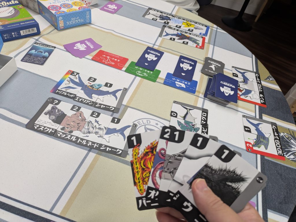 B級サメ映画をモチーフにした作品ですっと持っててお客さんがやってるのしか見たことなかったんでずっとやりたかった。3色の頭、体、尾に分かれたサメのカードと同じ3色に分かれたエネミーのカード。手番ではサメを引いたら手札に、エネミーを引いたら共通の場に裏向きに配置。毎ターン自分のサメに体をつけ強化できカードに書かれた数字が強さになる。手番でカードを配置し、エネミーに対し襲撃ができる。色を宣言し全員の中でその色中で強いサメがエネミーと戦い勝利するとエネミーが勝利点になる。サメマゲドンを引いてしまうと強制で襲撃ターンが発生。勝ったサメも参戦できないサメも強制的に排除されてしまうので思わぬタイミングで襲撃が起きてしまう。サメのパーツが多く機械だったり、ウニだったりマグロなんてのもあり作ってるだけで楽しい